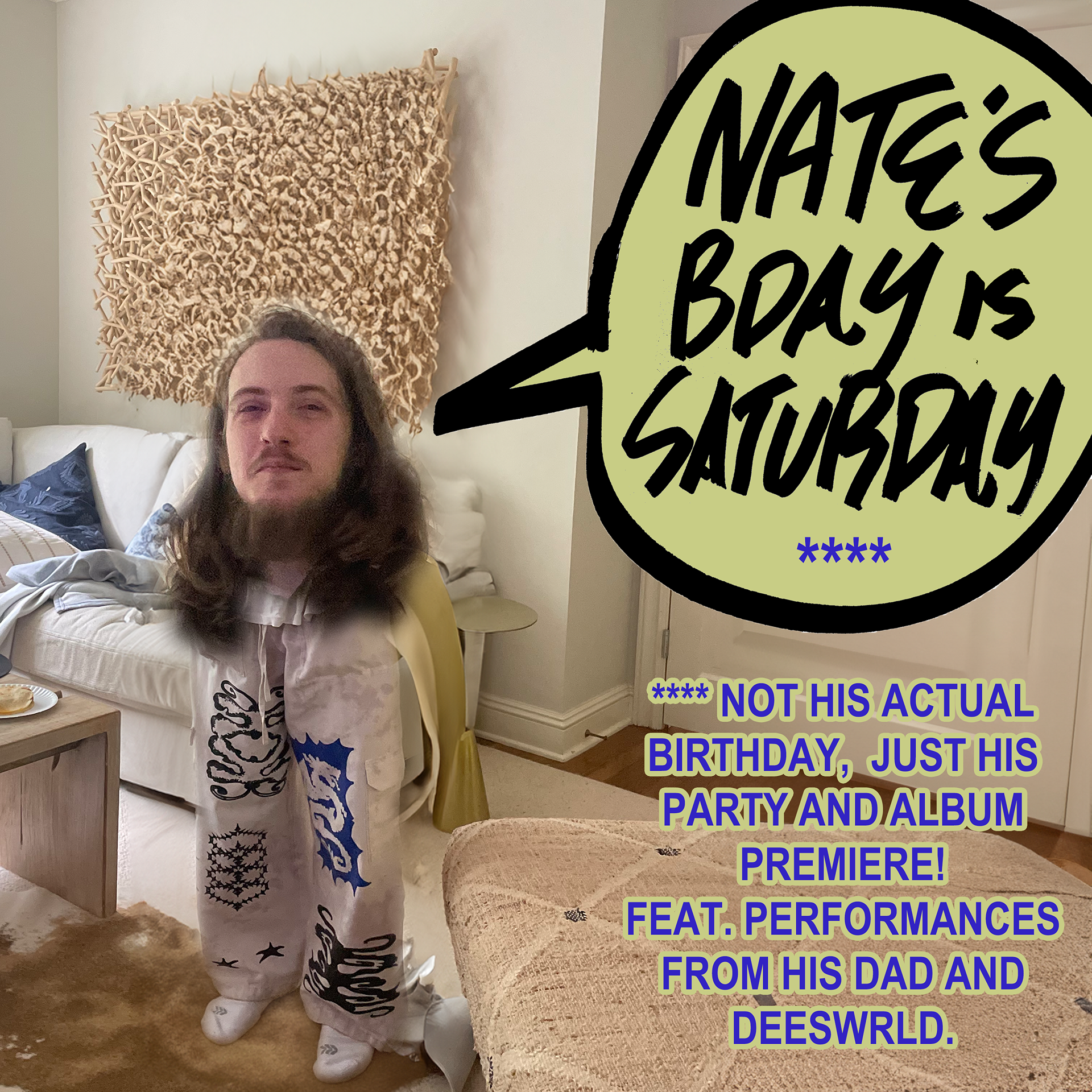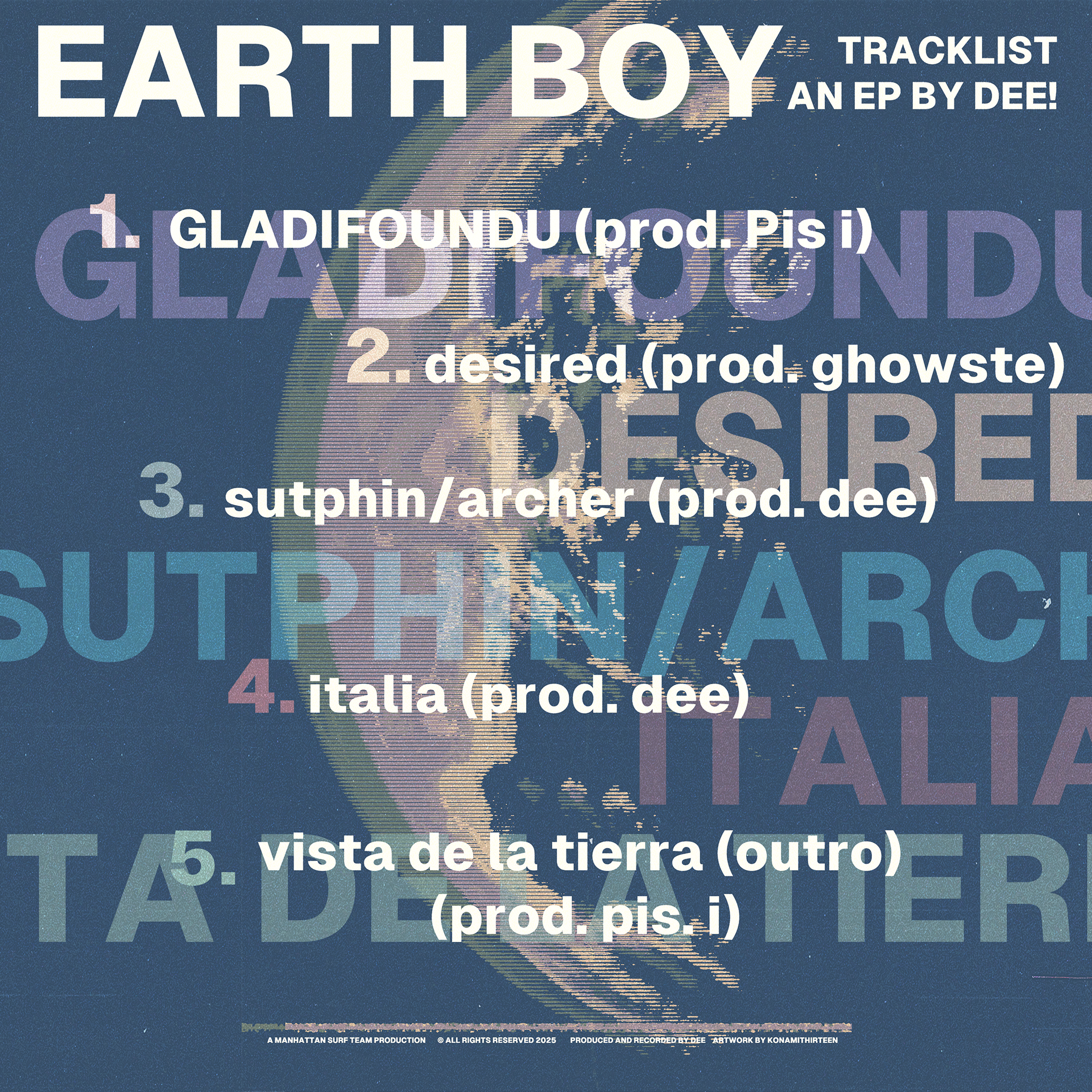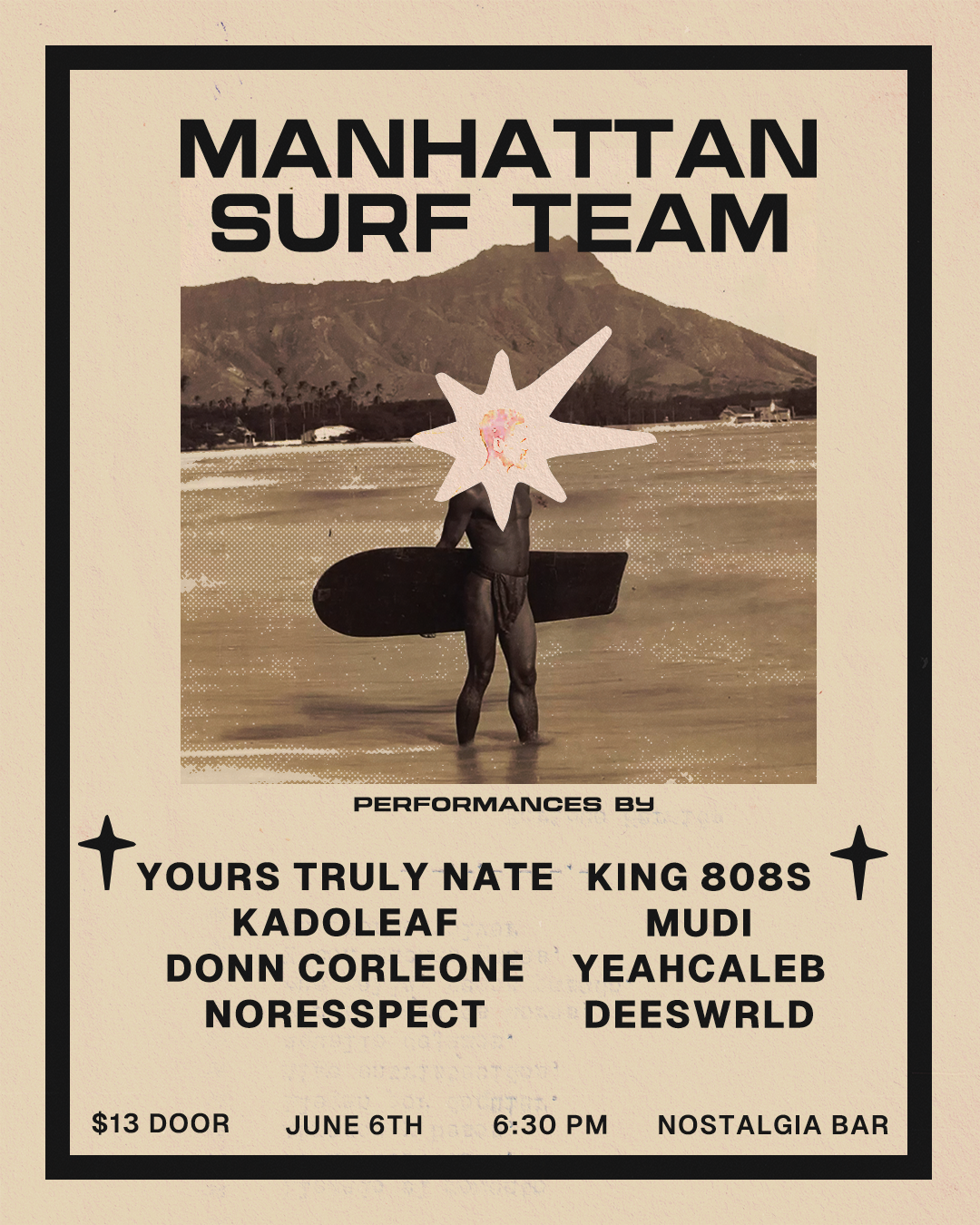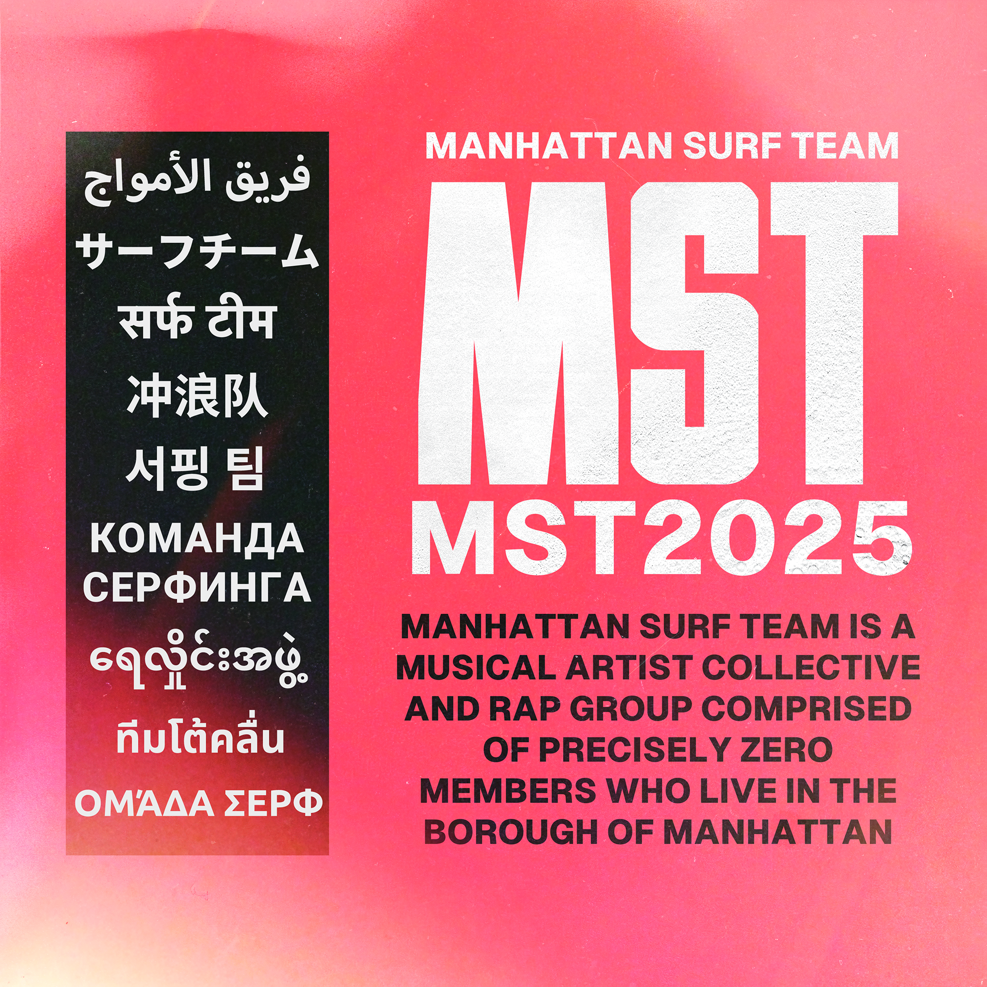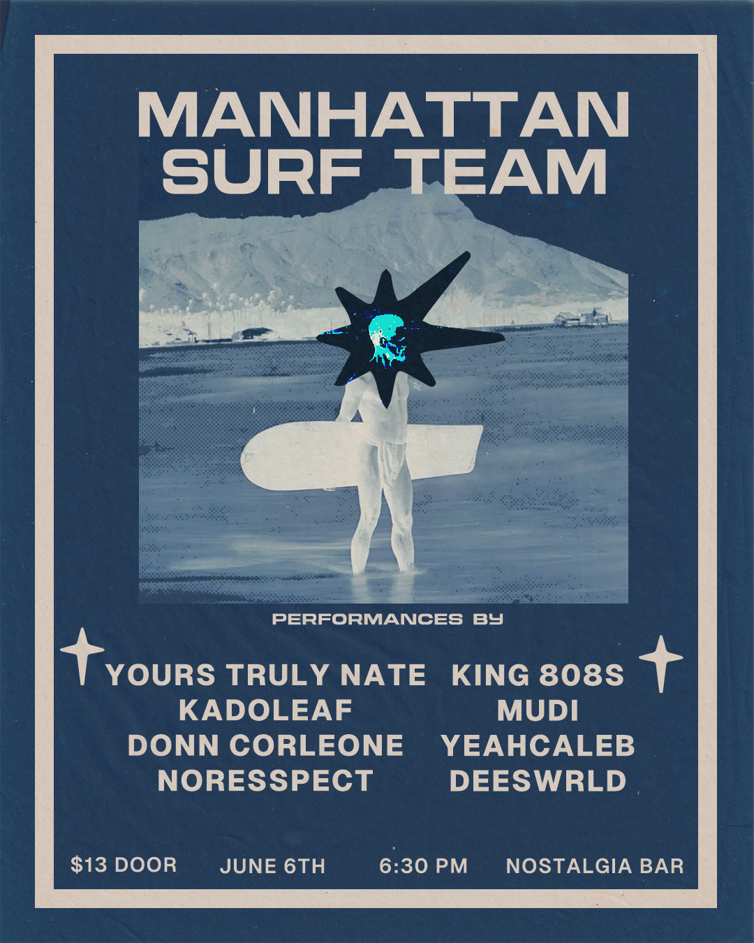 In November 2023, my roommate and close friend Jordan Reid (NoResspect) told me one of his friends, Nate Moore, was starting a music collective and needed a graphic designer. Ever since, I have been a contributing member and in-house art director for Manhattan Surf Team, a group of musicians from the New York City metro area pushing R&B and Hip-Hop to new heights. It's been an honor to work with a group of so many creatives who truly respect their art form and creative processes. Everything on this page is promotional material or clothing design, but you can find many of the album covers I've made for them on that page.